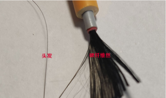 下圖是頭發與碳纖維絲的近間隔拍攝比照。
